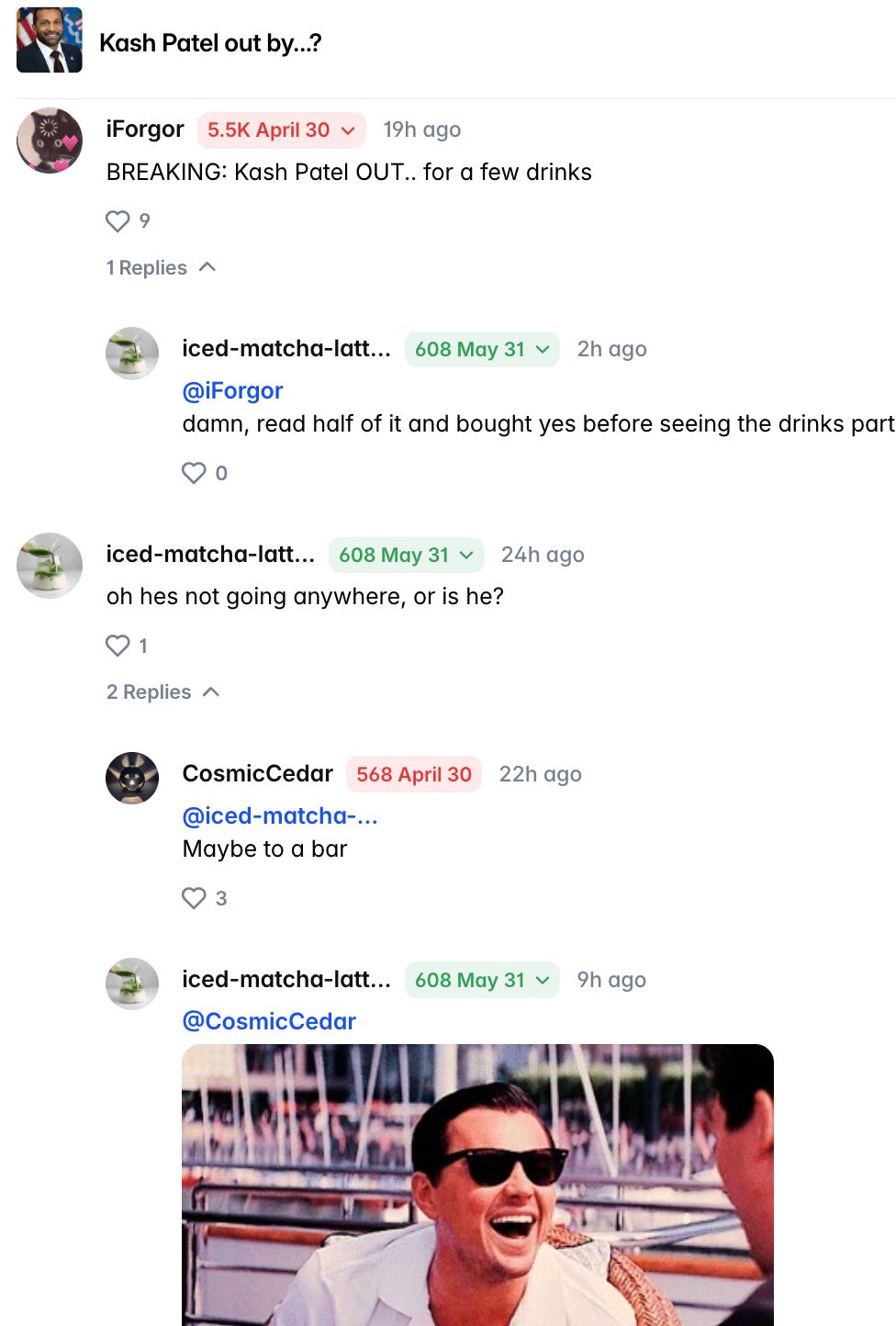 To that point: If you haven’t taken a look at these sites, they basically all have their own built in troll boxes. Look at this one for the market, FBI Director “Kash Patel out by…”: