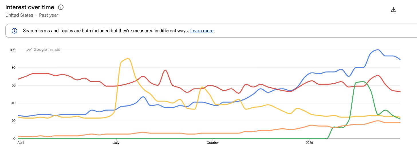 I threw OpenClaw in here as another baseline with current topics. I tried comparing these to “ChatGPT” as well but it blew all these topics away, so that shows you where this all sits relatively. AI remains the biggest topic on earth.